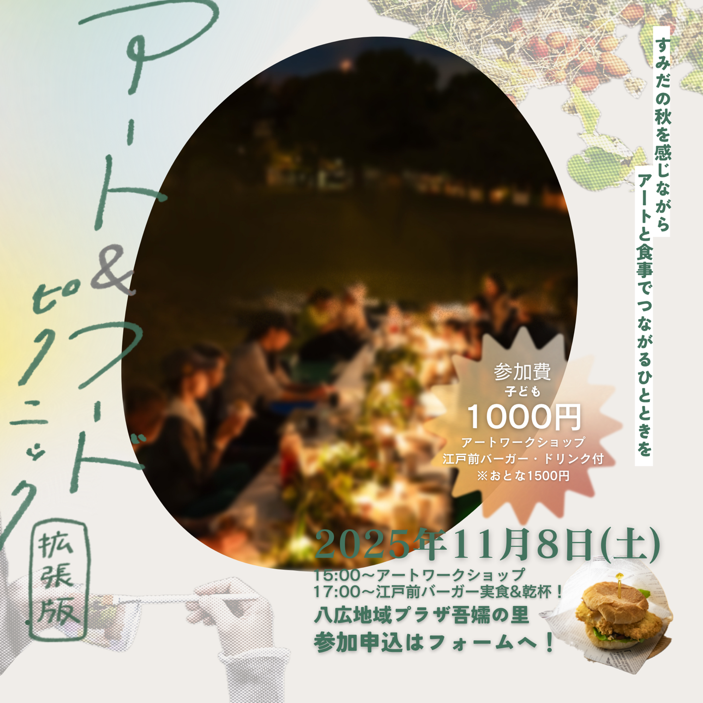 ●参加費:大人:1,500円 / 子ども:1,000円(アートワークショップ+江戸前バーガー付)